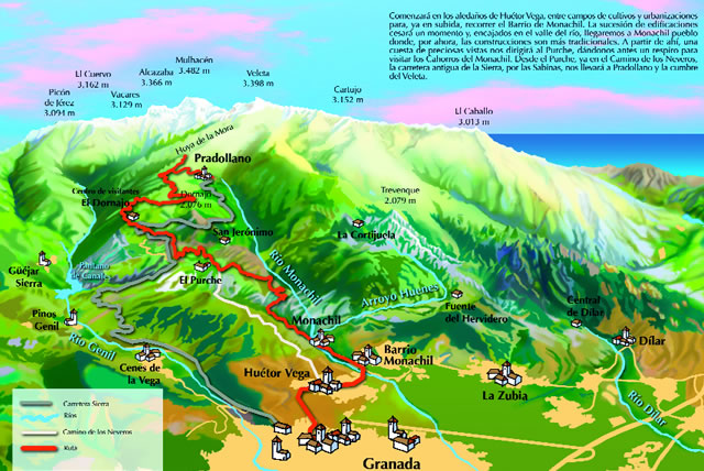 Comenzamos en Granada y pasando por Huetor Vega nos dirigimos a Monachil, donde cruzaremos el río y podremos disfrutar si así lo deseamos de un descanso para reponer fuerzas en alguno de los merenderos que nos iremos enconrando. Seguiremos hacia el Purche, con un elevado desnivel que nos permitirá disfrutar de maravillosas vistas, pasaremos por el Camping, donde el camino nos da un respiro con un suave descenso hasta la carretera de Sierra Nevada que seguiremos hasta llegar al Centro de Interpretación del Dornajo, donde seguiremos la antígua carretera hasta llegar a la zona de las Sabinas, pudiendo descender hacia Pradollano o continuar nuestra ruta hasta la zona de los albergues.
