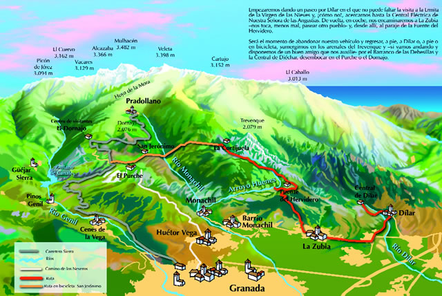 Por fin, bien desde Dílar o La Zubia, la sierra pura y dura que, acotada por los ríos Dílar y Monachil que casi llega a comunicar el arroyo Huenes, nos va a conducir, entre arenales y picos de renombre –el de la Carne; el del Tesoro; el de los Pollos; el, no se nos podía olvidar, Trevenque- hasta la carretera de la sierra, enlazando con la ruta anterior cerca del Dornajo. Pero no sólo veremos picos y plantas ya que, aunque nos parezca extraño, nos servirá este recorrido para acercarnos al poblamiento humano de la sierra, representado por los tradicionales cortijos.